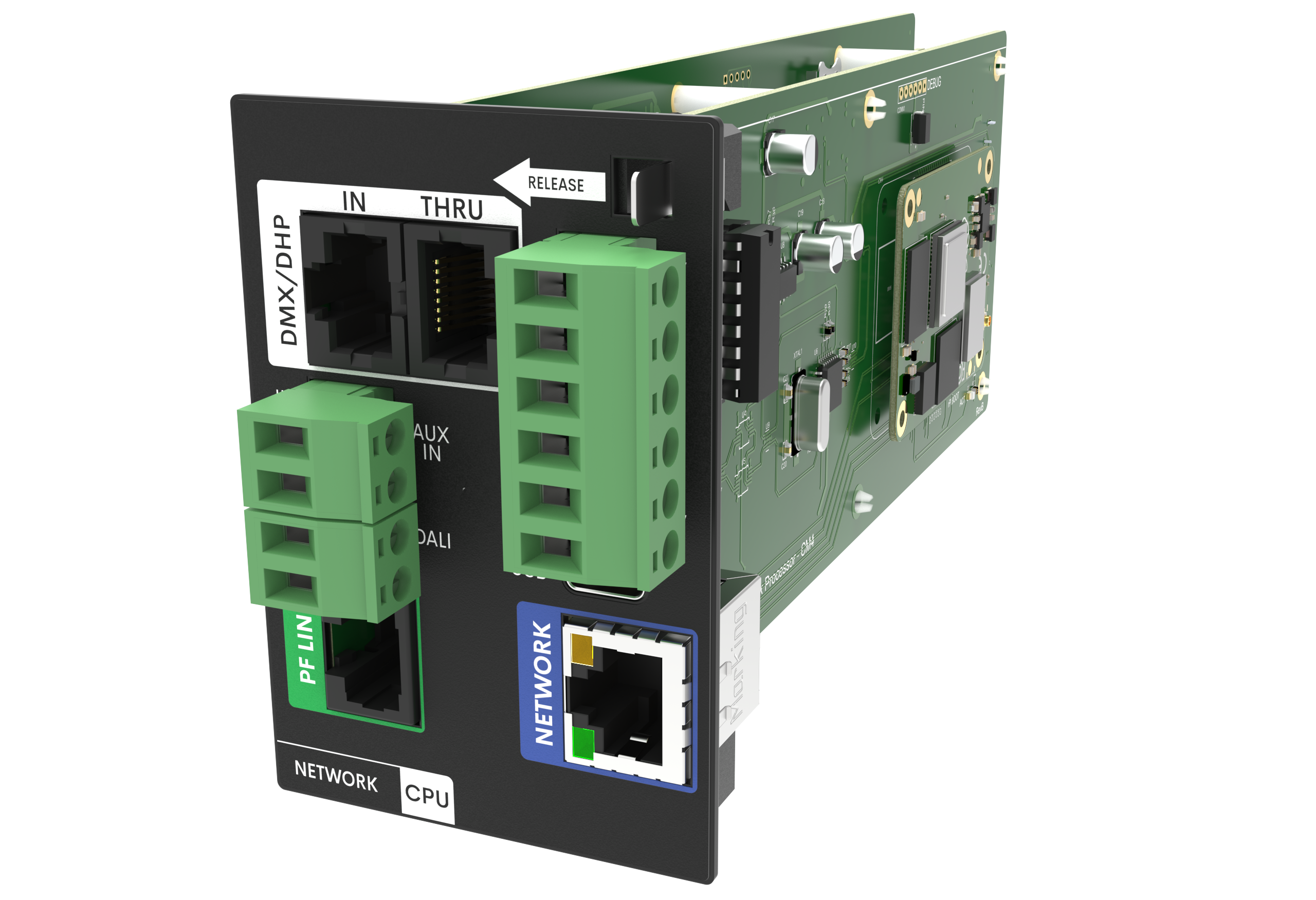 Processor Cards are the essential interface in the Drive Hub ecosystem. All card types provide industry-standard DMX and DALI interfaces, PF Link for extensible Power Frame reporting and a single auxiliary contact for combining external circuits. The network card has the addition of an ethernet connection and 4 extra auxiliary contacts. When connected to a network, a web application is accessible, providing system-wide configuration and reporting.