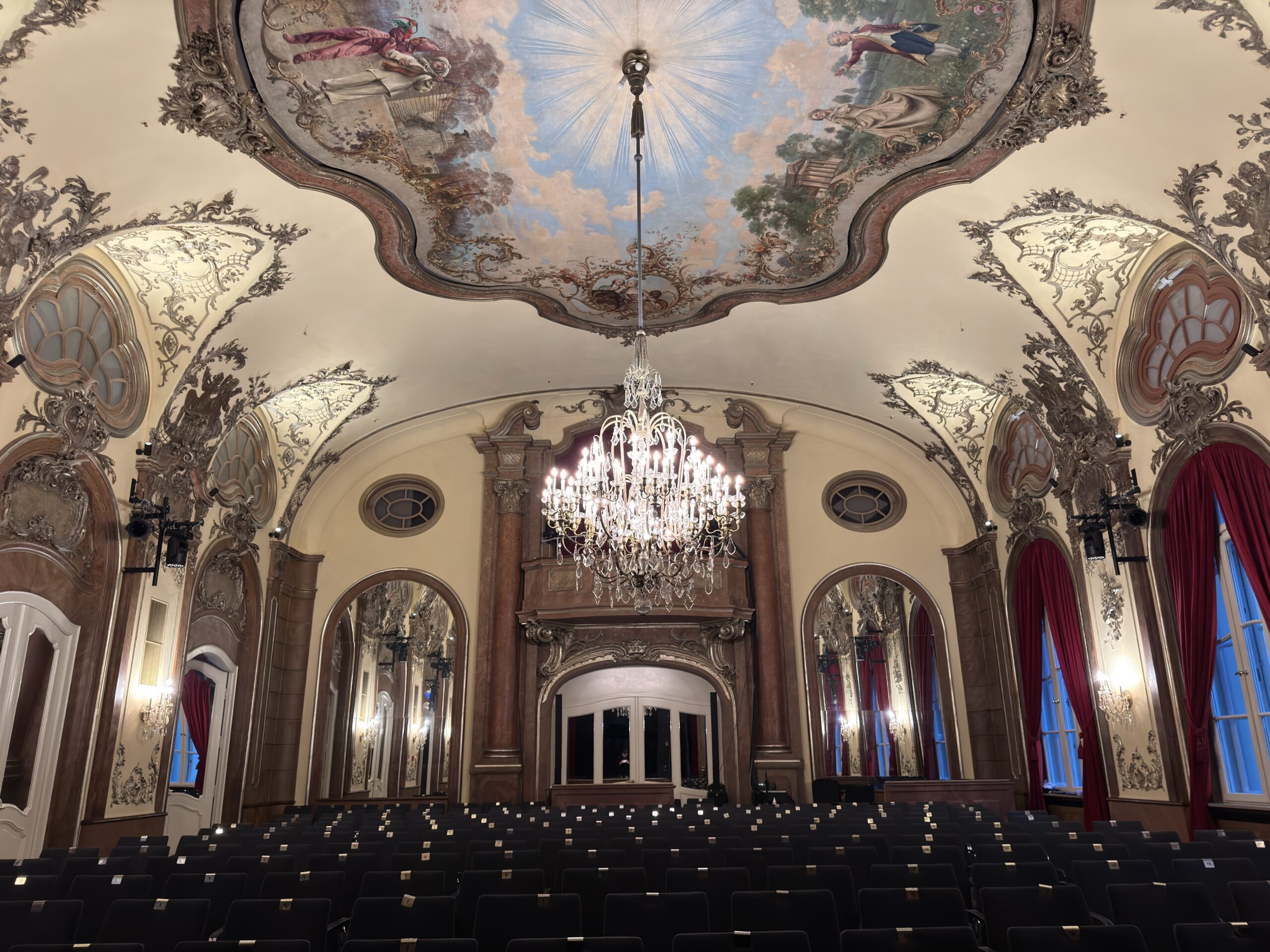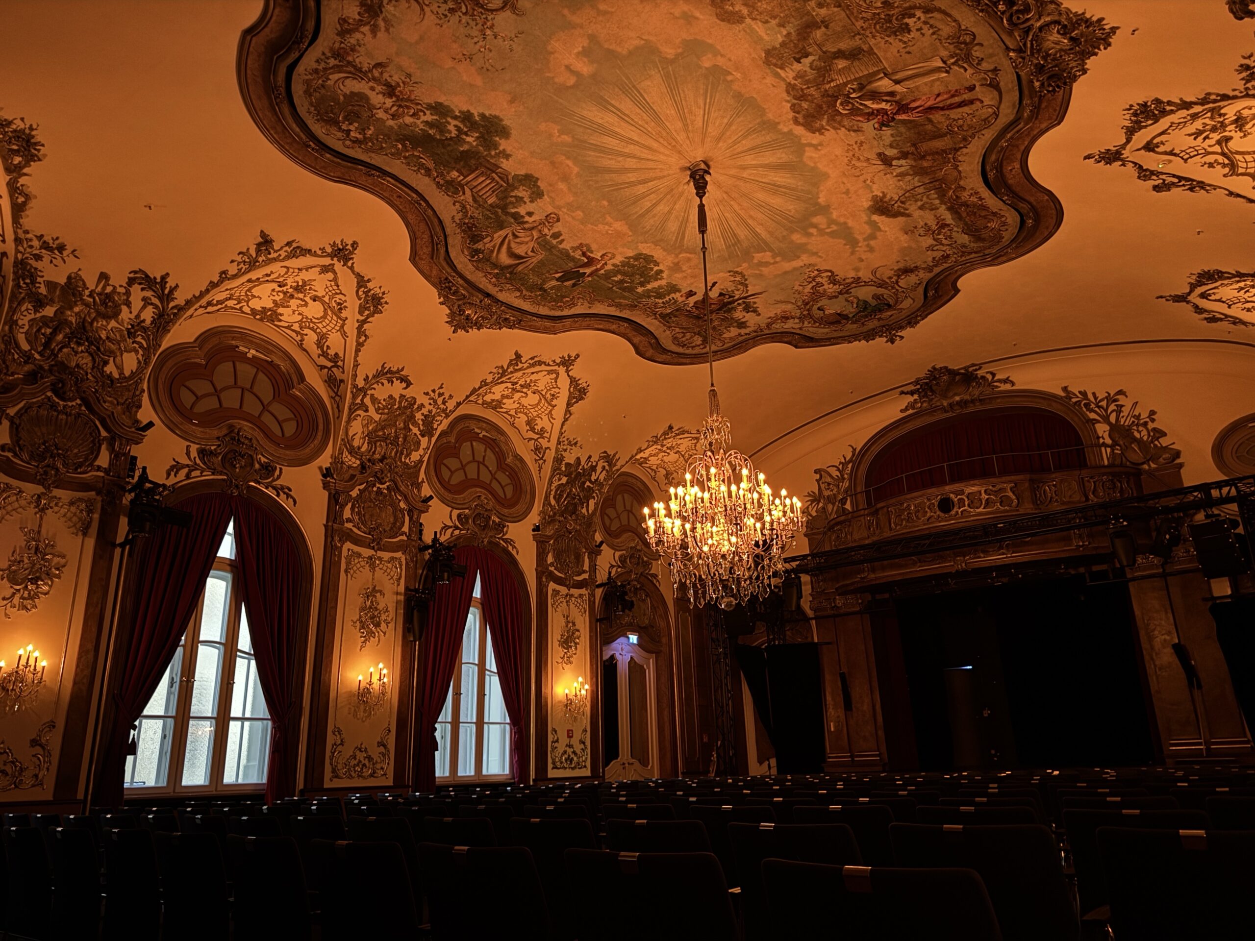 The Silver Hall is the last original room remaining, having remained in use since the theatre first opened. Its ornate chandeliers, decorative wall sconces and arched window features define the architectural character of the space, with warm halogen lighting forming an essential part of its atmosphere.
